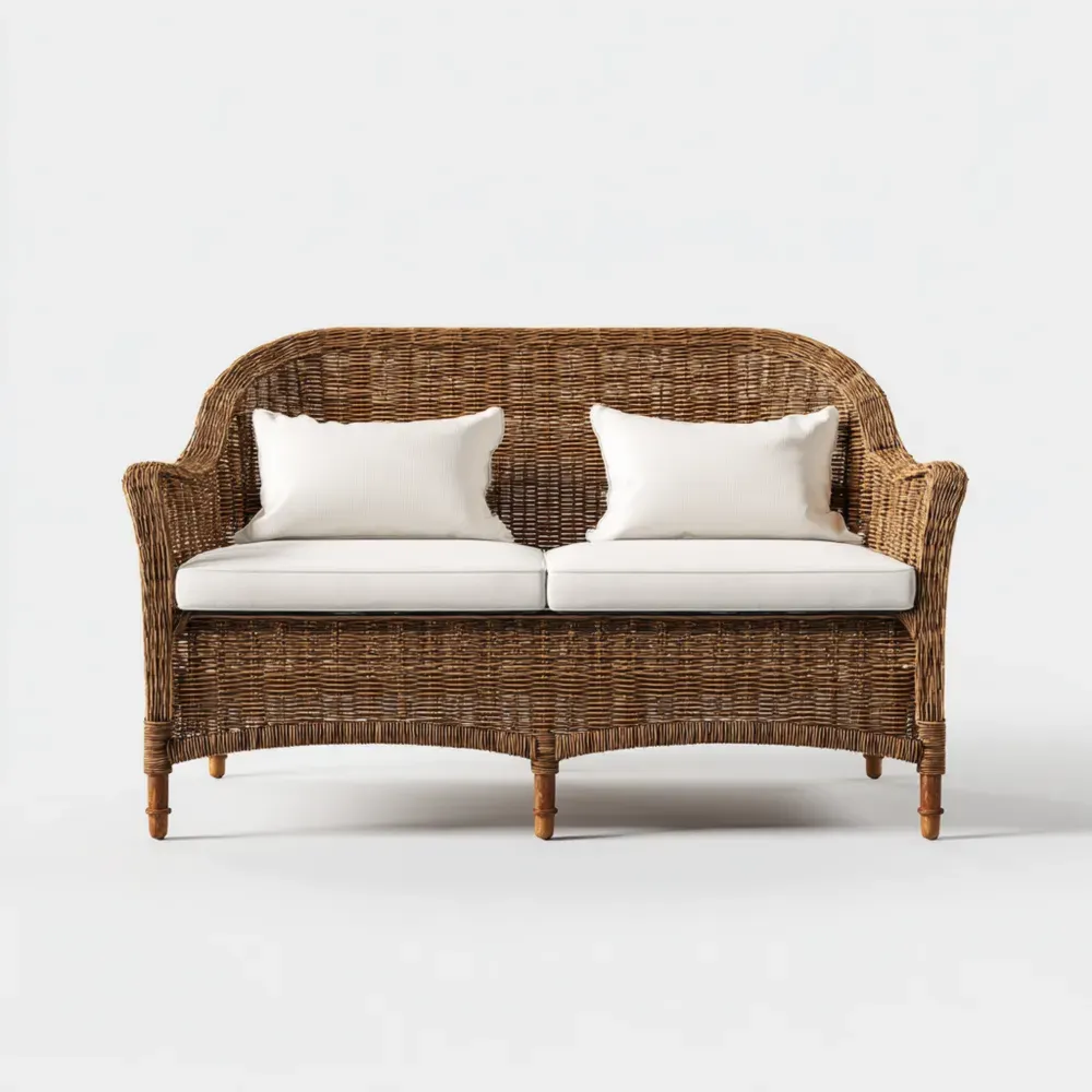 Material y AcabadoFabricado con ratán de alta calidad en un elegante color Marrón, este sofá está diseñado para resistir las inclemencias del tiempo mientras mantiene su estilo sofisticado. Los cojines son de color Blanco.